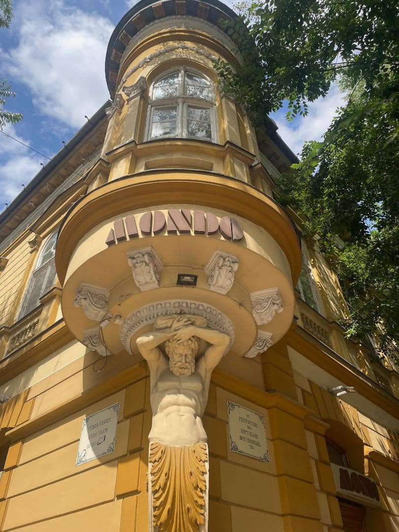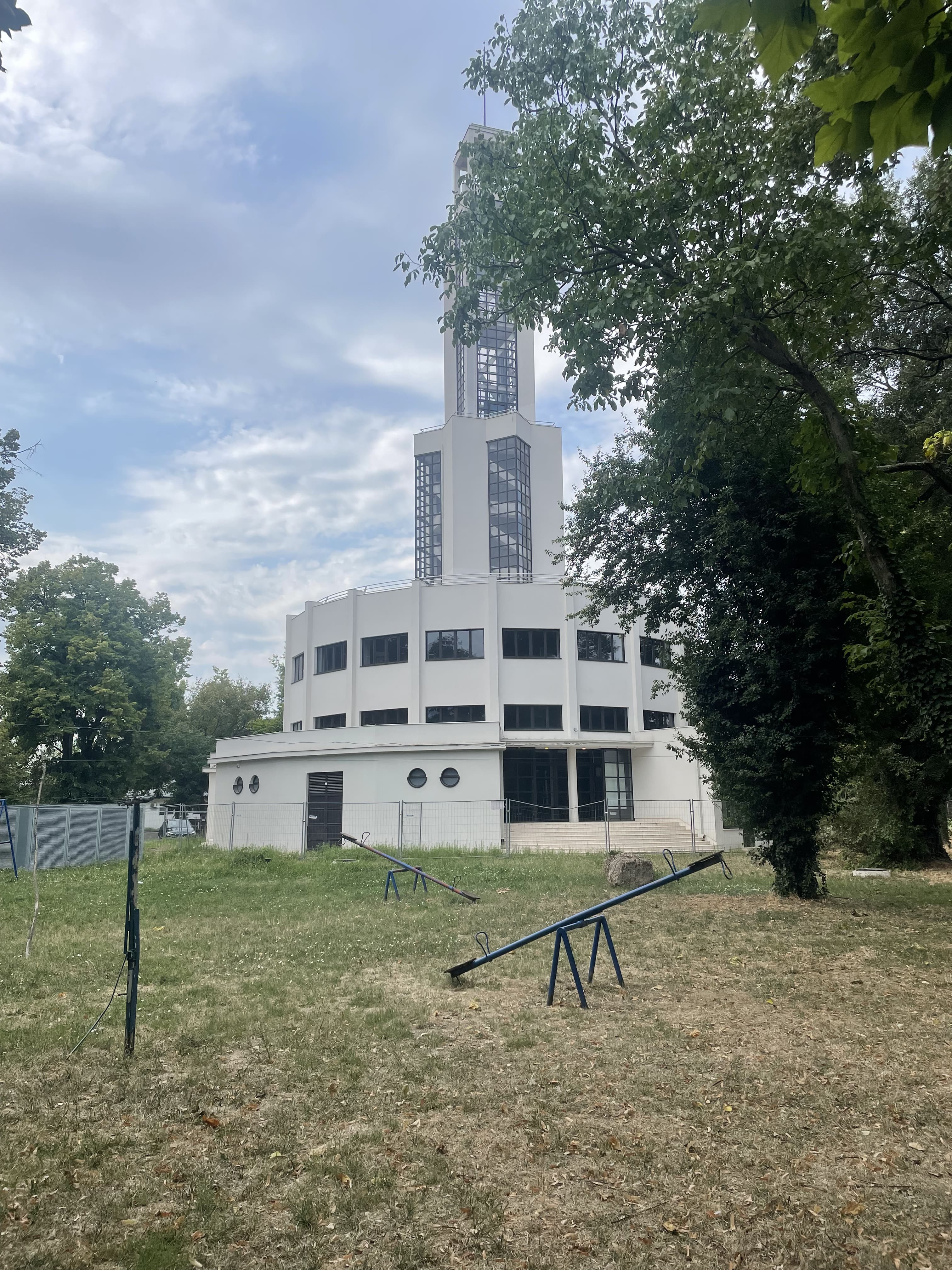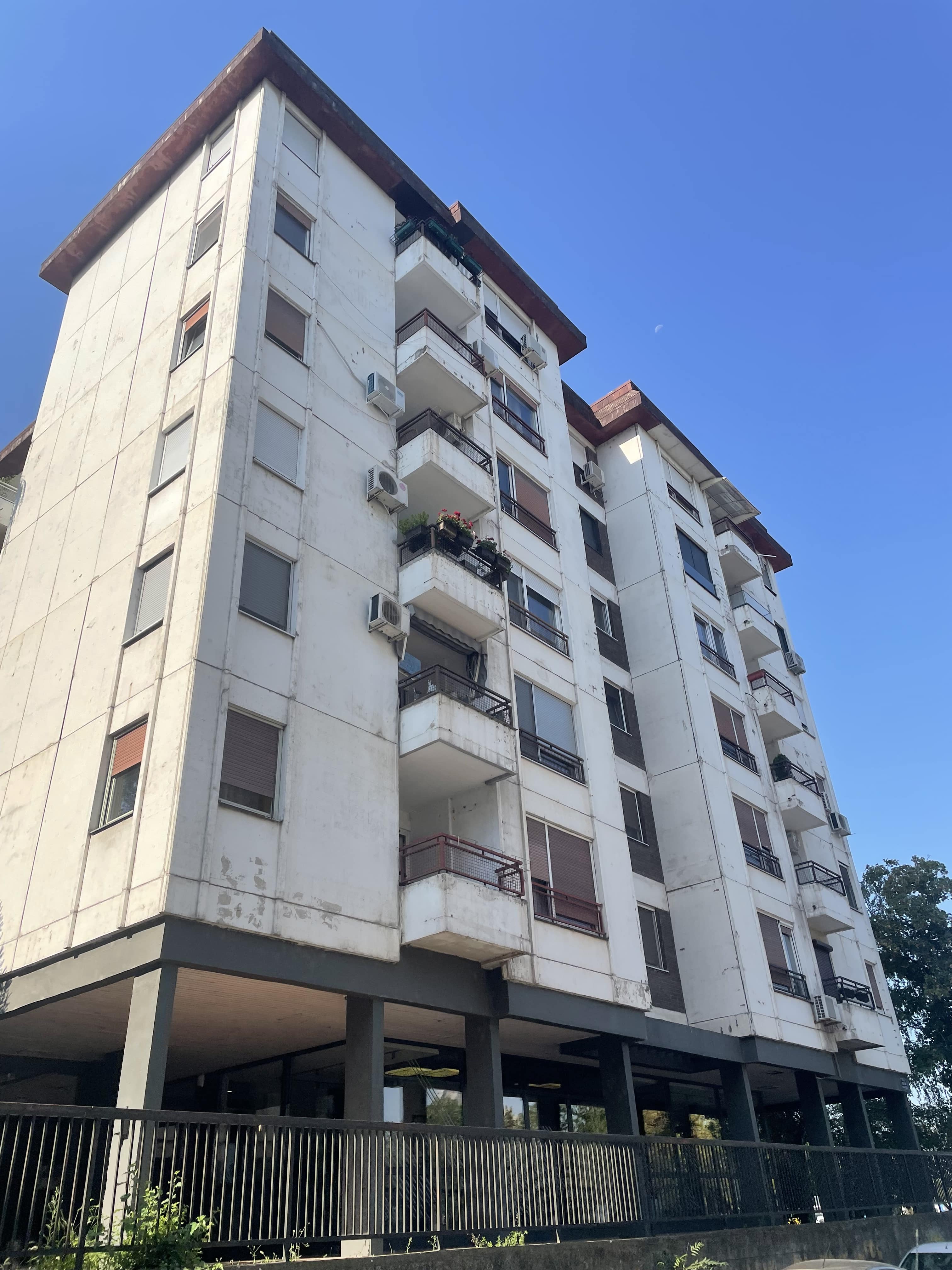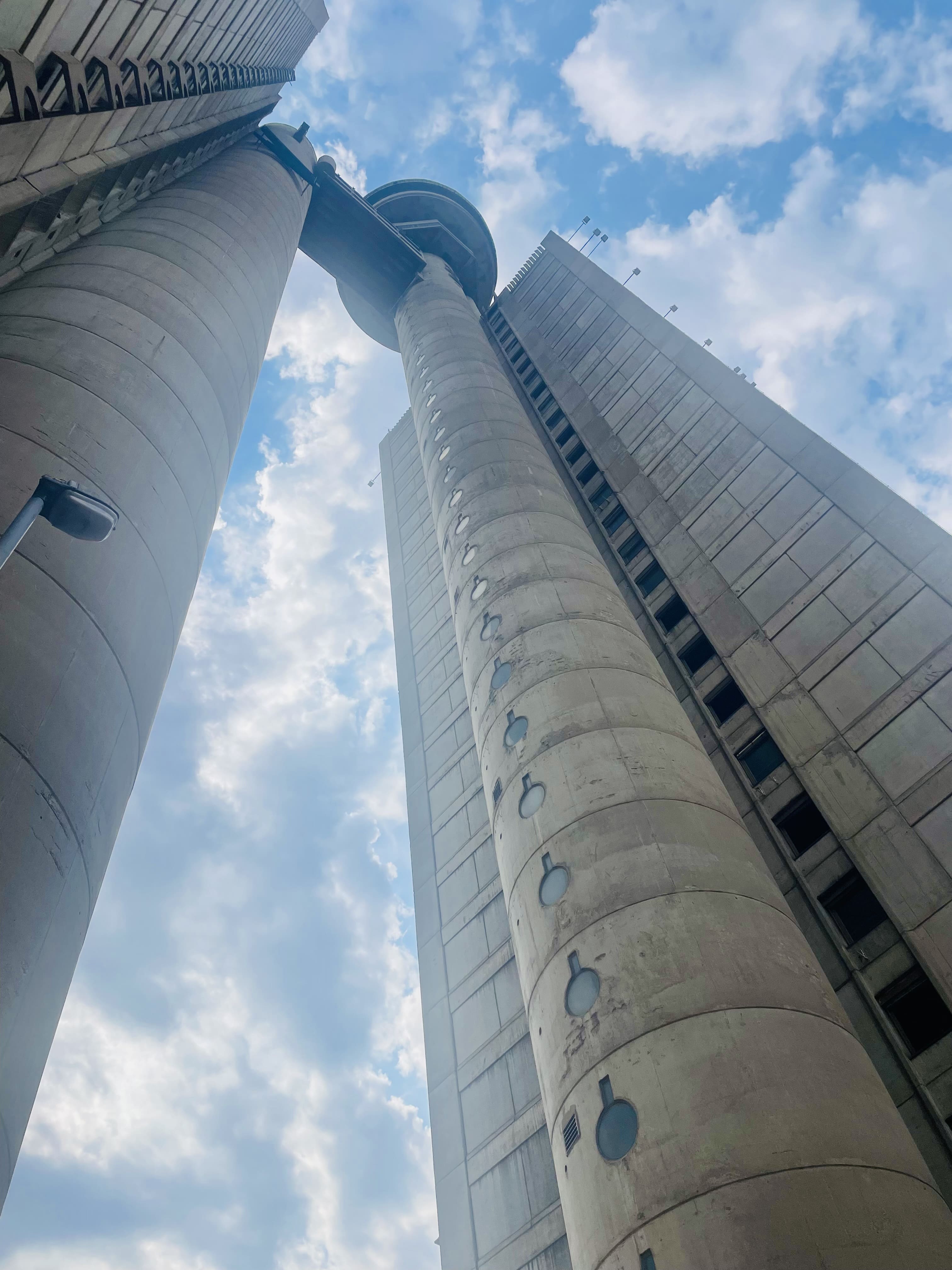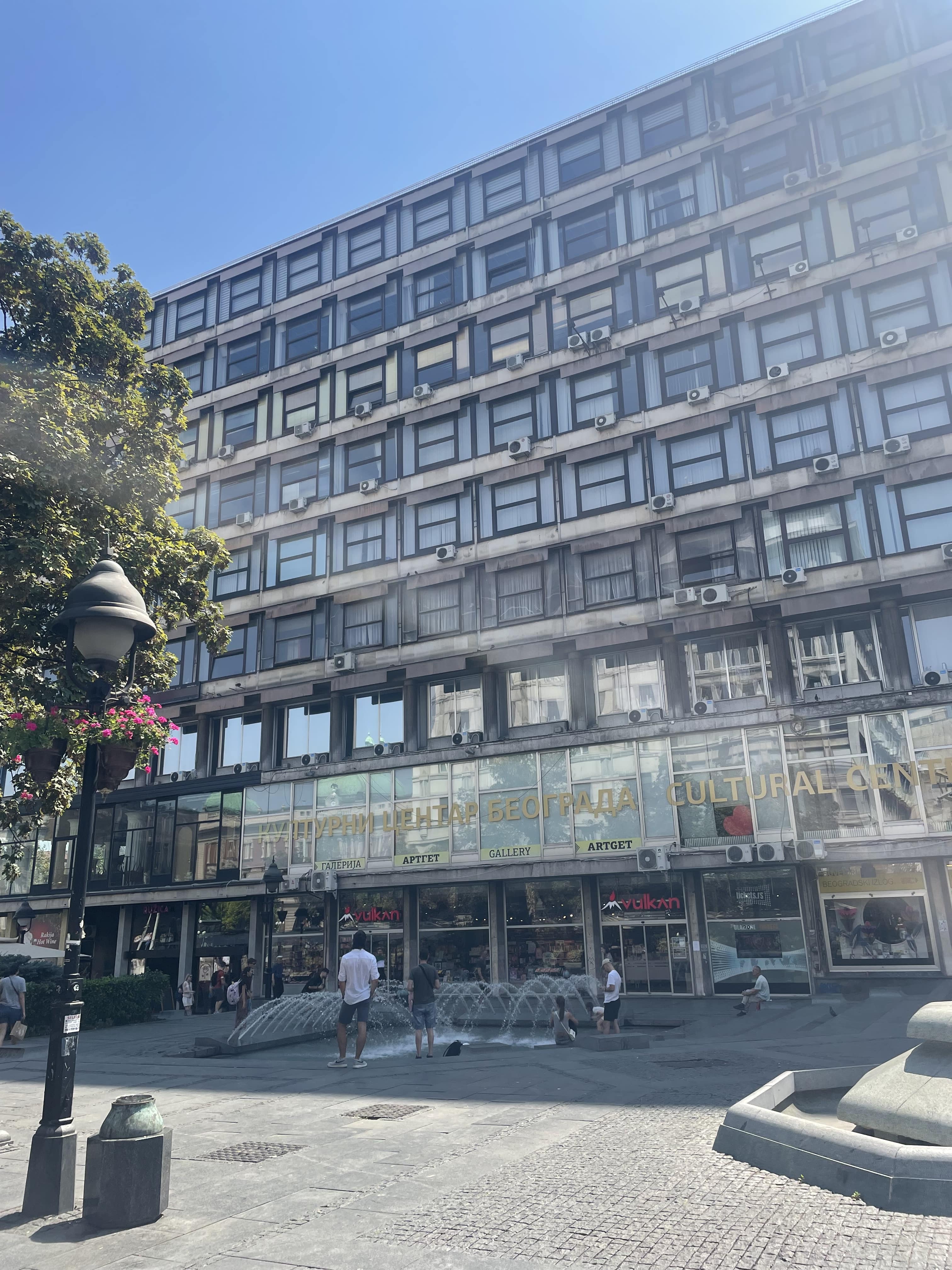 Nous nous arrêtons ensuite au pied de la tour Genex, deuxième plus haut bâtiment de Belgrade. Construite en 1977, elle est un symbole de l’architecture brutaliste. À son sommet, un restaurant rotatif — aujourd’hui abandonné — reliait les deux tours.