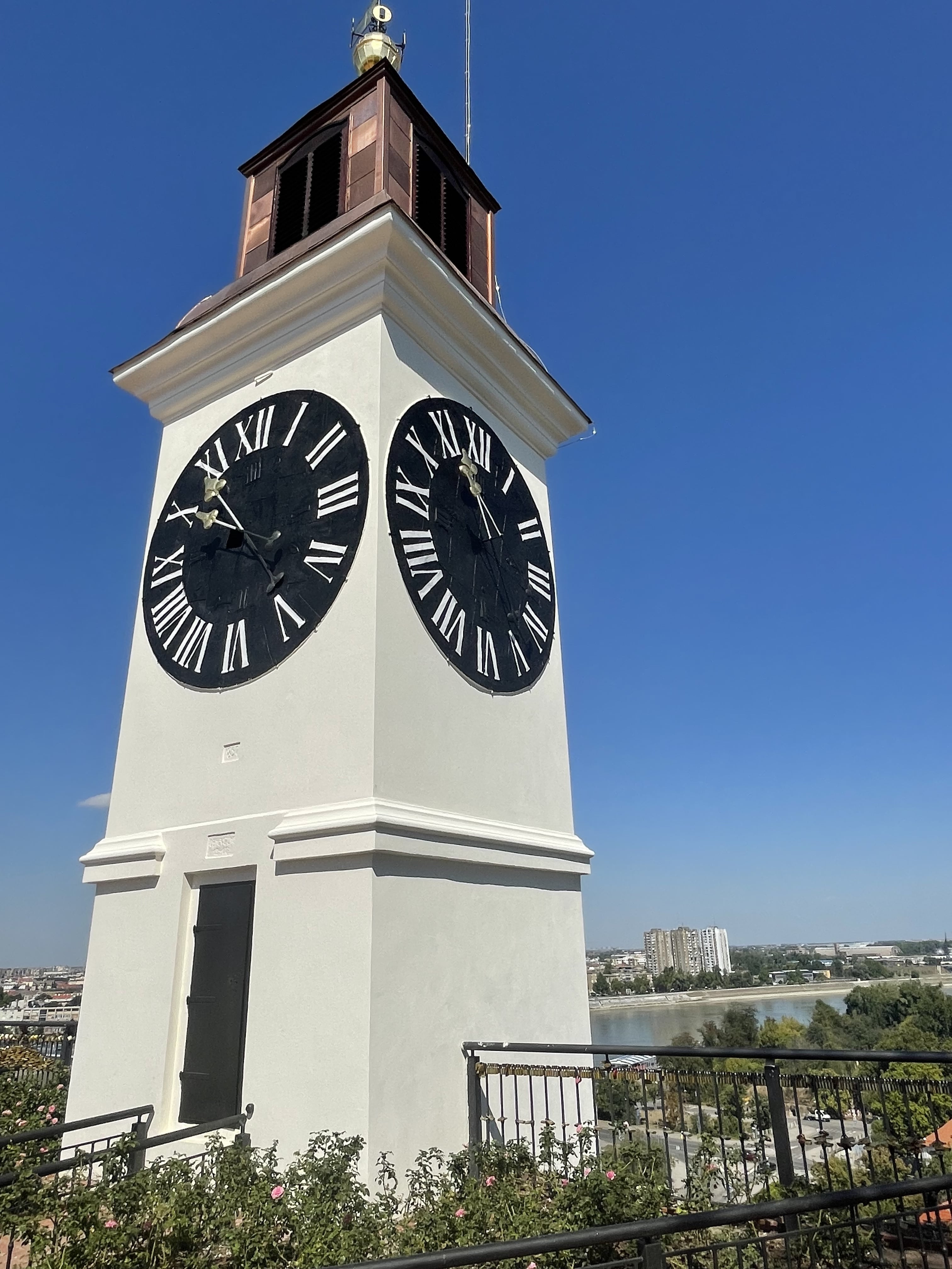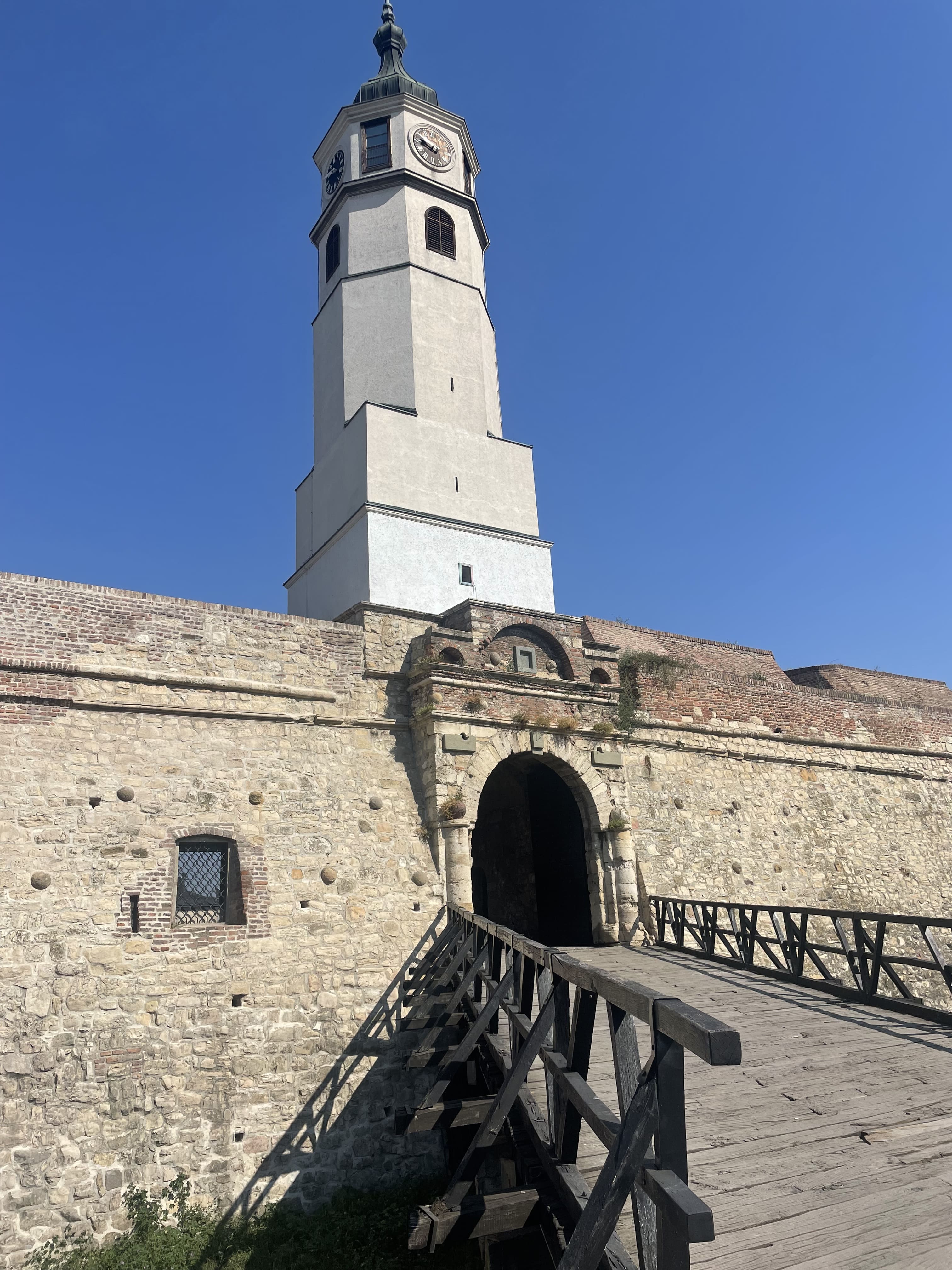 La forteresse de Petrovaradin, surnommée « le Gibraltar du Danube », est une immense fortification construite au 17ème siècle par les Autrichiens pour repousser les Ottomans. Elle abrite un réseau souterrain de tunnels long de près de 16 km, encore aujourd’hui en grande partie inexploré. Tout en haut, nous faisons le tour des bastions, visitons la fameuse tour de l’horloge, dont l’aiguille des heures et celle des minutes sont inversées — une particularité conçue pour que les bateaux sur le Danube puissent lire l’heure de loin. La vue depuis les remparts sur le Danube et sur Novi Sad est superbe.