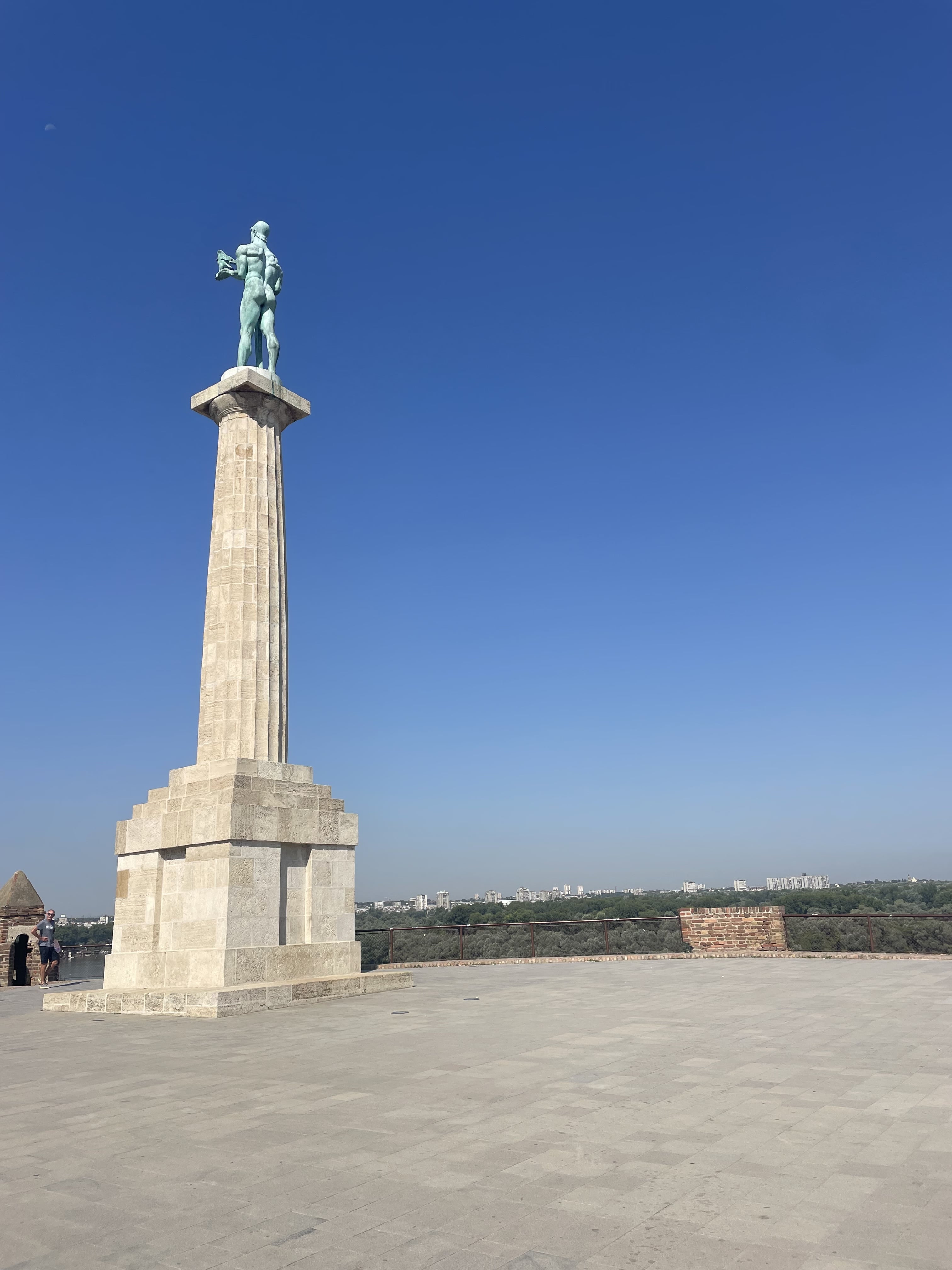 Nous déambulons entre les pavillons de la ville basse, visitons la tour de l’horloge et le musée militaire dans la ville haute, où se succèdent de nombreux chars, canons et avions. Depuis l’esplanade, la vue sur la confluence est superbe. Nous nous arrêtons devant la statue du « Pobednik » (“le Victorieux”), symbole iconique de la ville, érigée pour célébrer la victoire serbe sur l’Empire ottoman.