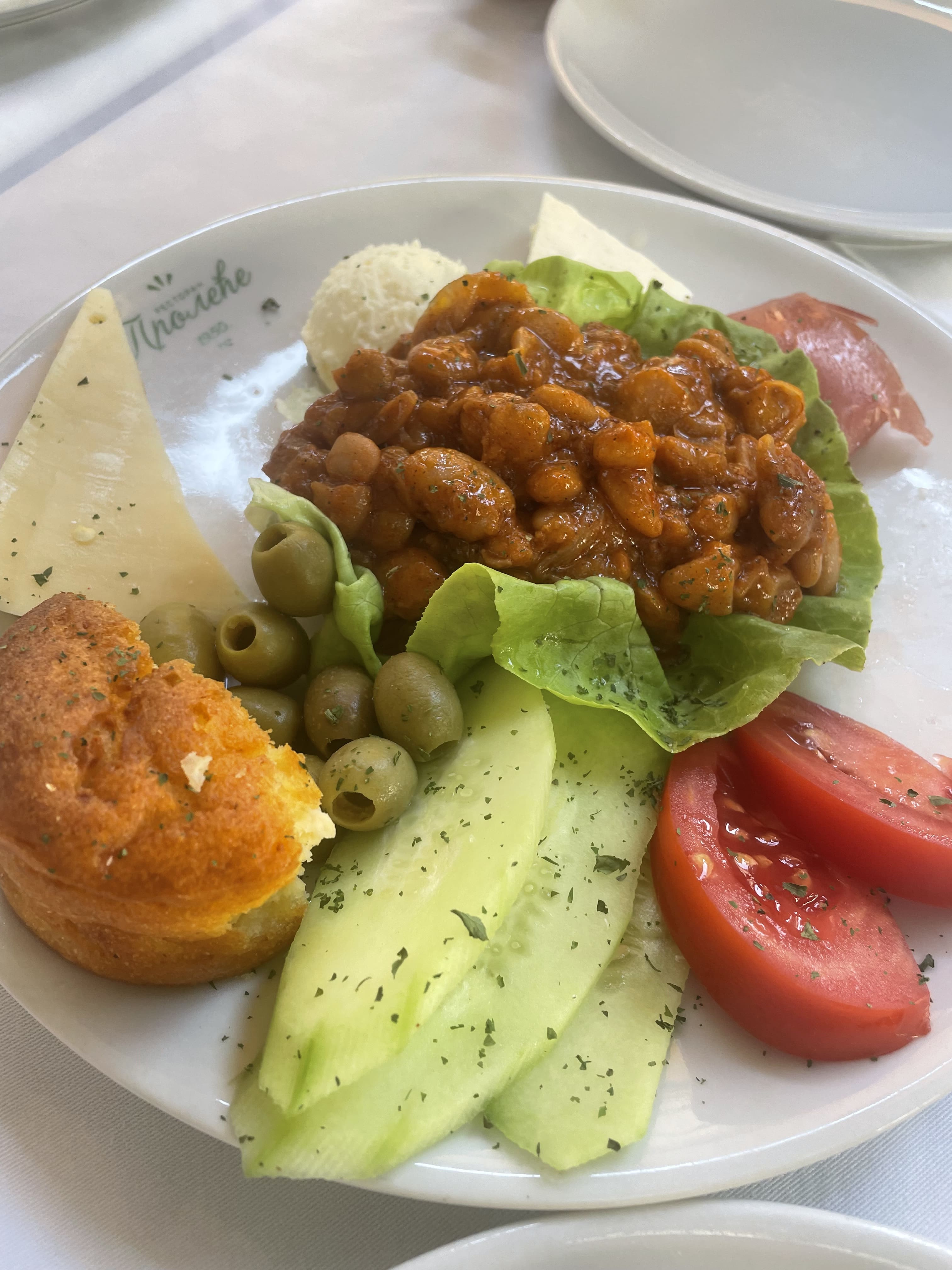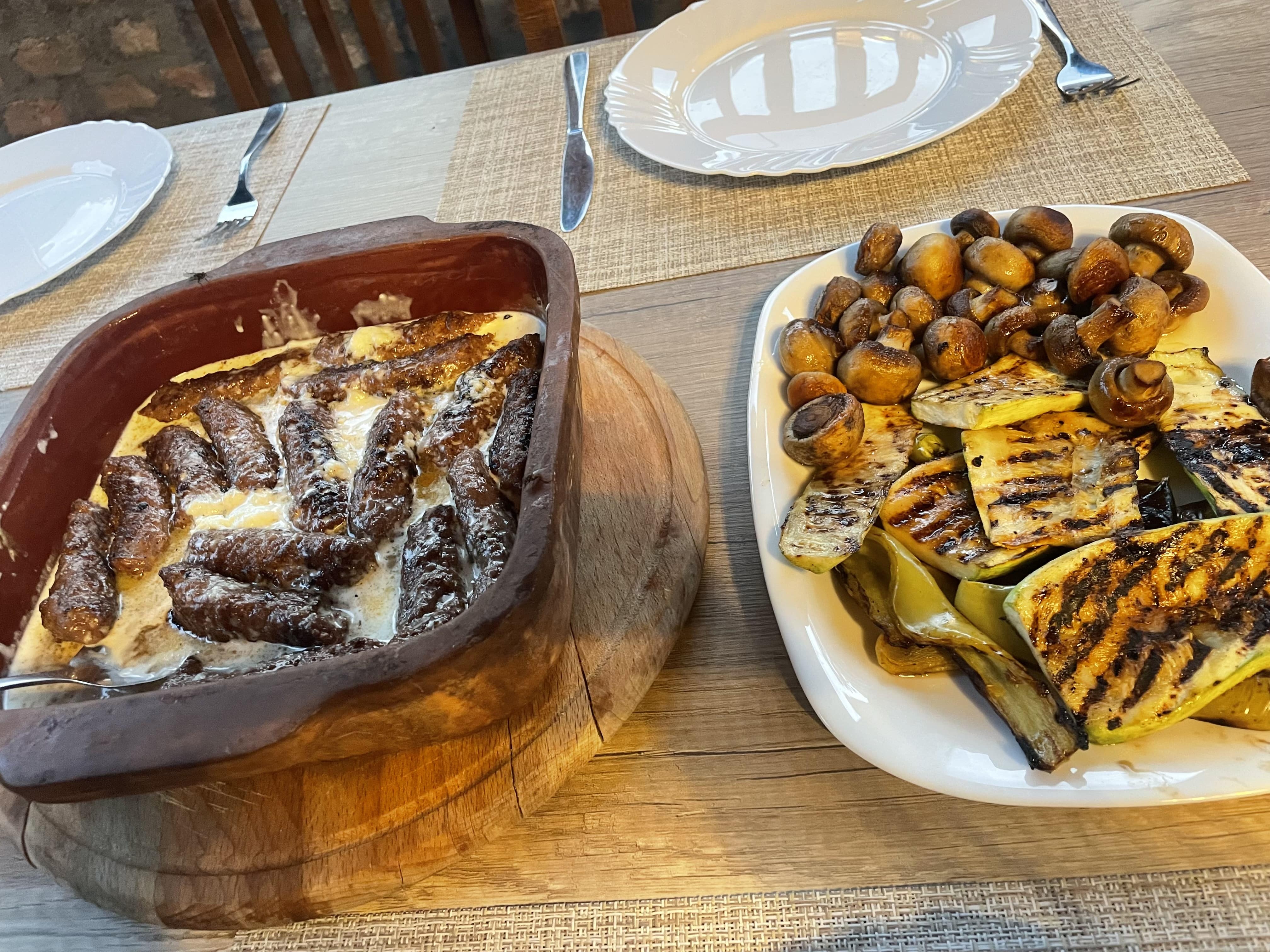 Le soir, nous dînons au gîte. Nous sommes les seuls, mais le repas est fantastique : l’hôte nous prépare des légumes grillés (champignons, courgettes, poivrons), une salade de feta et tomates, et les fameuses ćevapčići (kebabs allongés) accompagnées de kajmak, le fromage local crémeux typique de Serbie. Le tout pour un prix vraiment très compétitif : 2 400 RSD.
