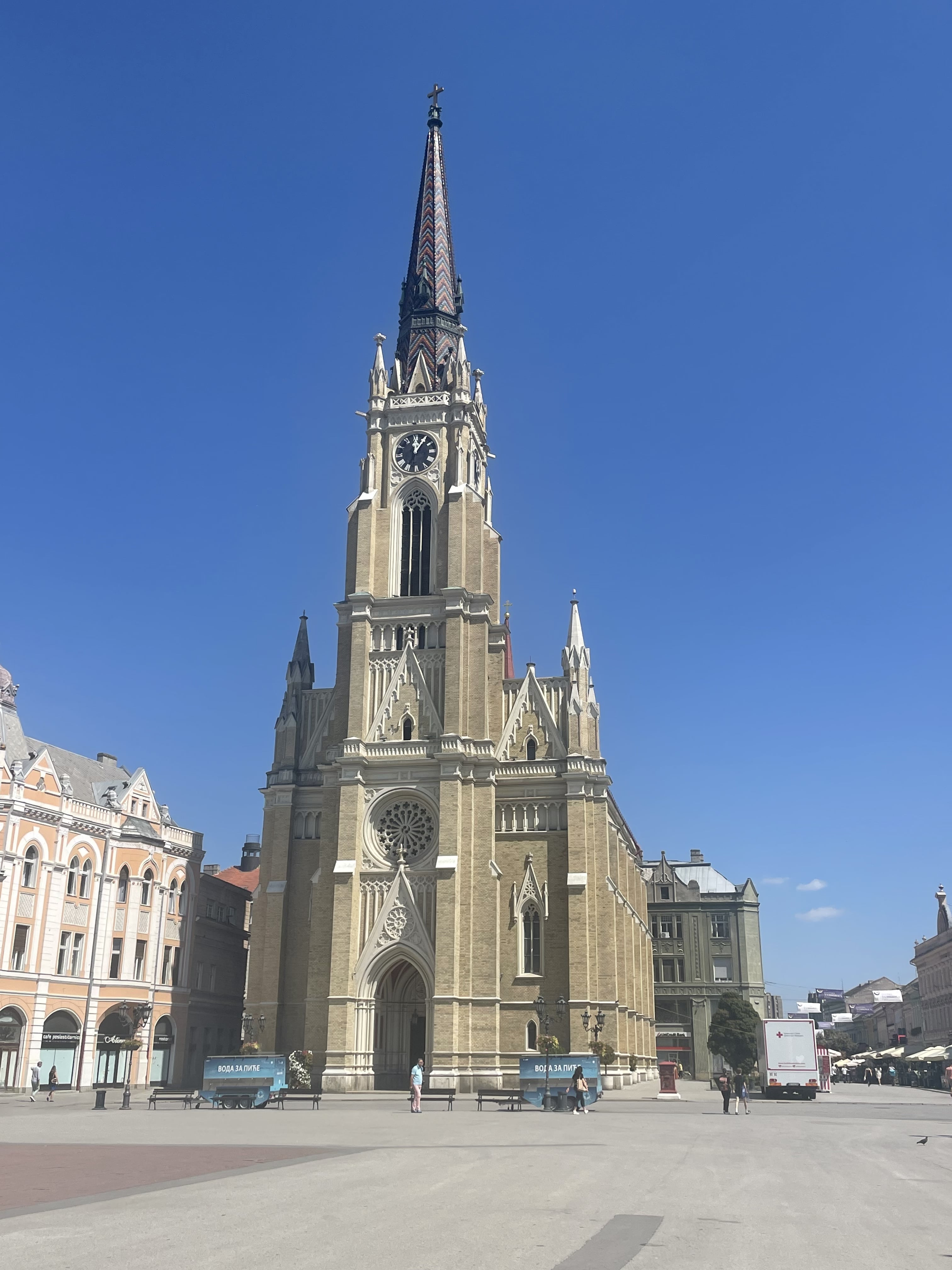 Nous retraversons le pont et nous dirigeons vers la place de la Liberté, entourée de l’Hôtel de Ville, de la Banque Nationale et de la grande cathédrale catholique du Nom-de-Marie, reconnaissable à son haut clocher néo-gothique.