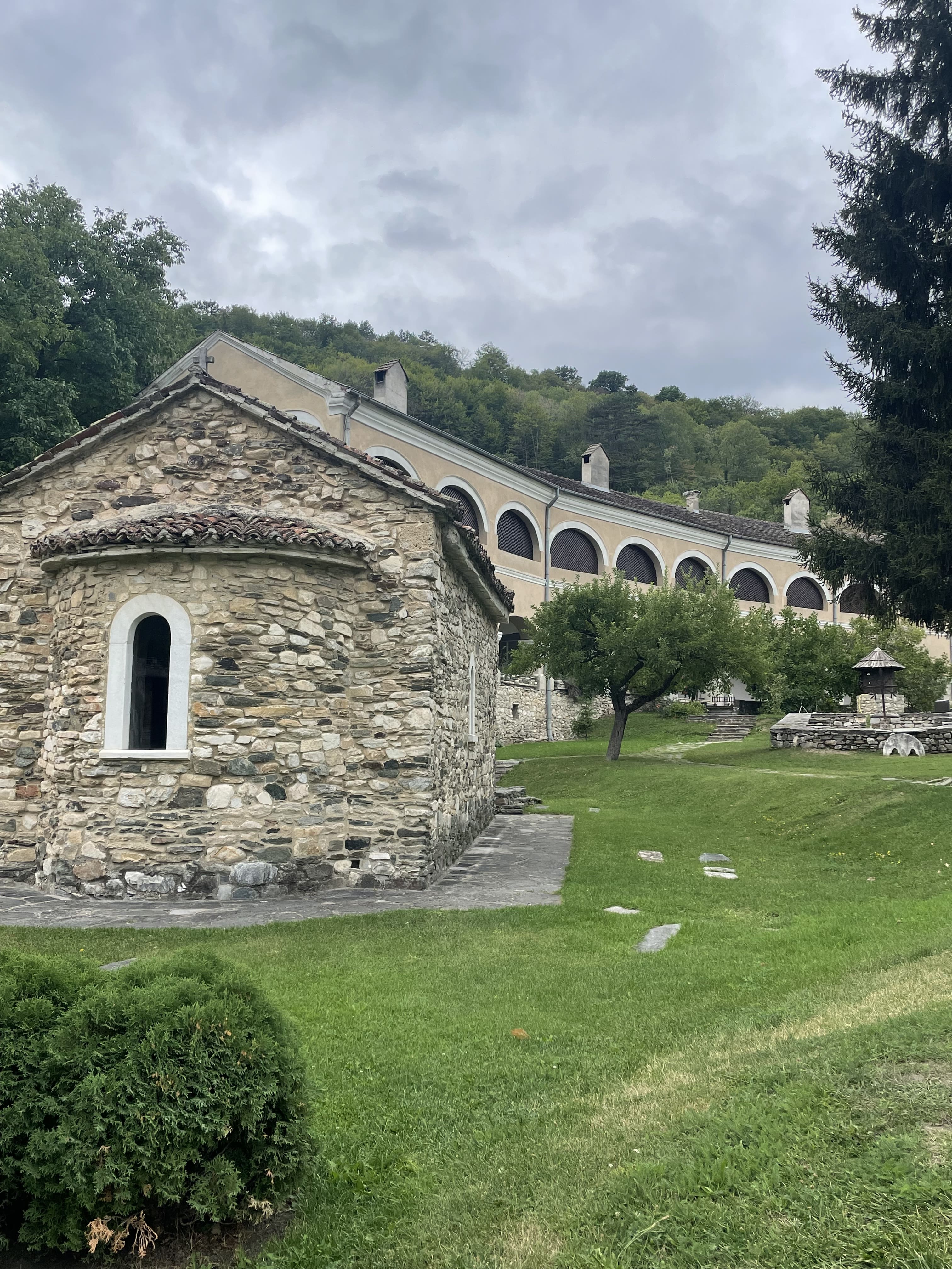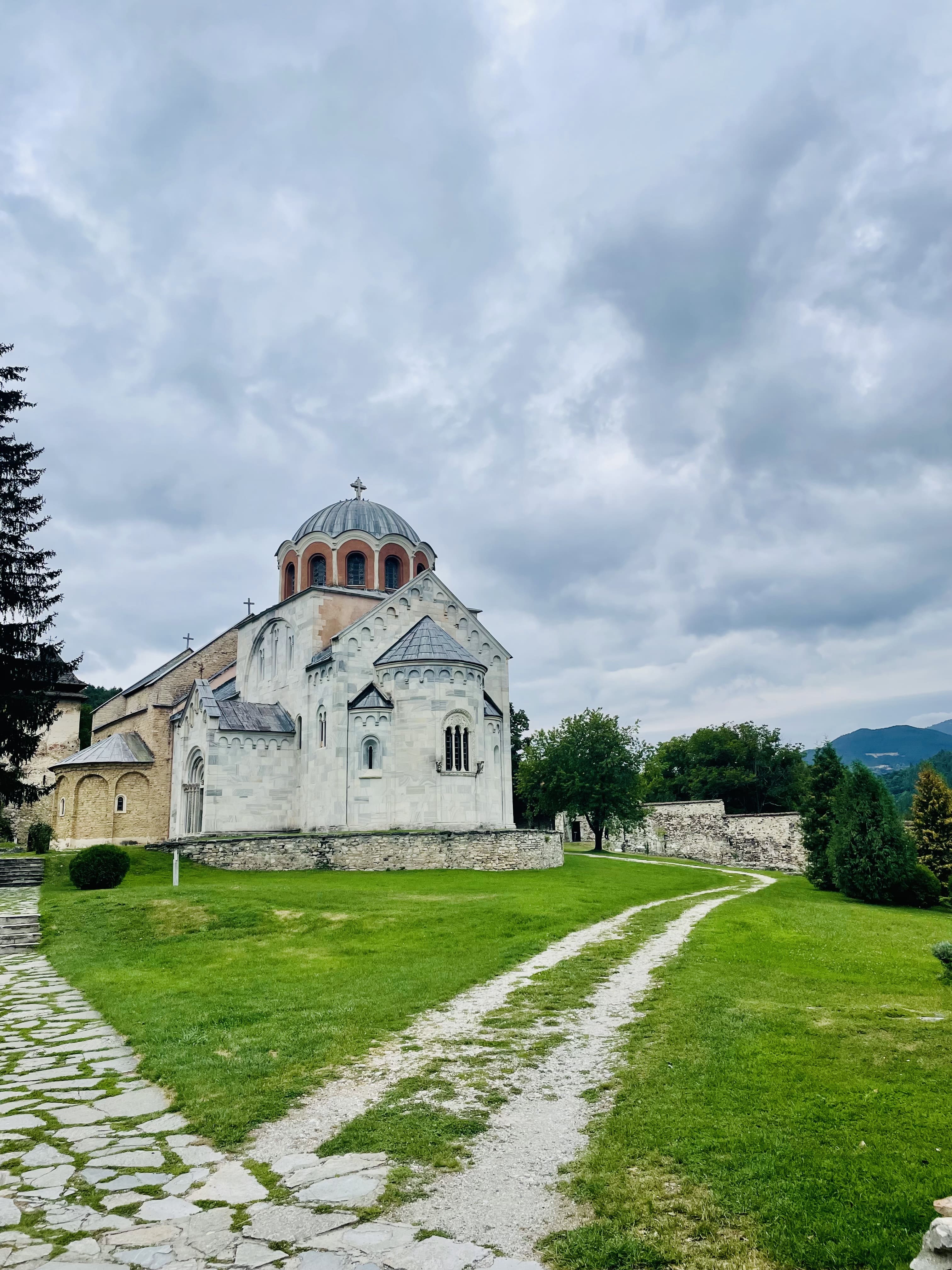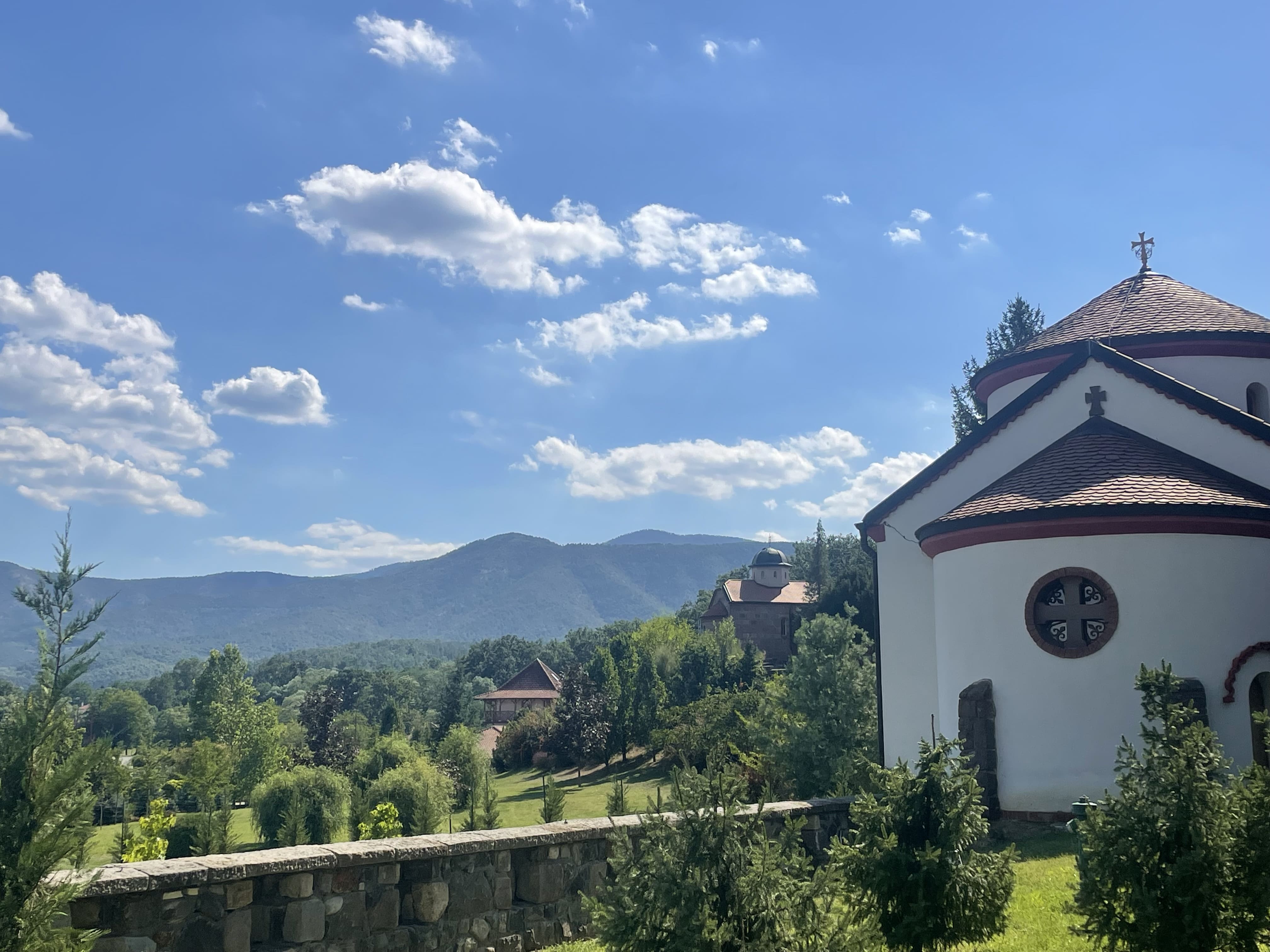 Nous repartons ensuite un peu plus dans les terres, vers les montagnes, pour visiter le monastère de Rača. Niché entre plusieurs collines et entouré d’une nature luxuriante, ce monastère du 13ème siècle fut fondé par le roi serbe Stefan Dragutin. Il abritait autrefois un important centre de transcription médiévale : c’est ici que travaillaient les célèbres “moines copistes de Rača”, qui ont préservé une grande partie de la littérature serbe du Moyen Âge. Le lieu, discret et isolé, dégage un charme paisible et un côté presque secret.
