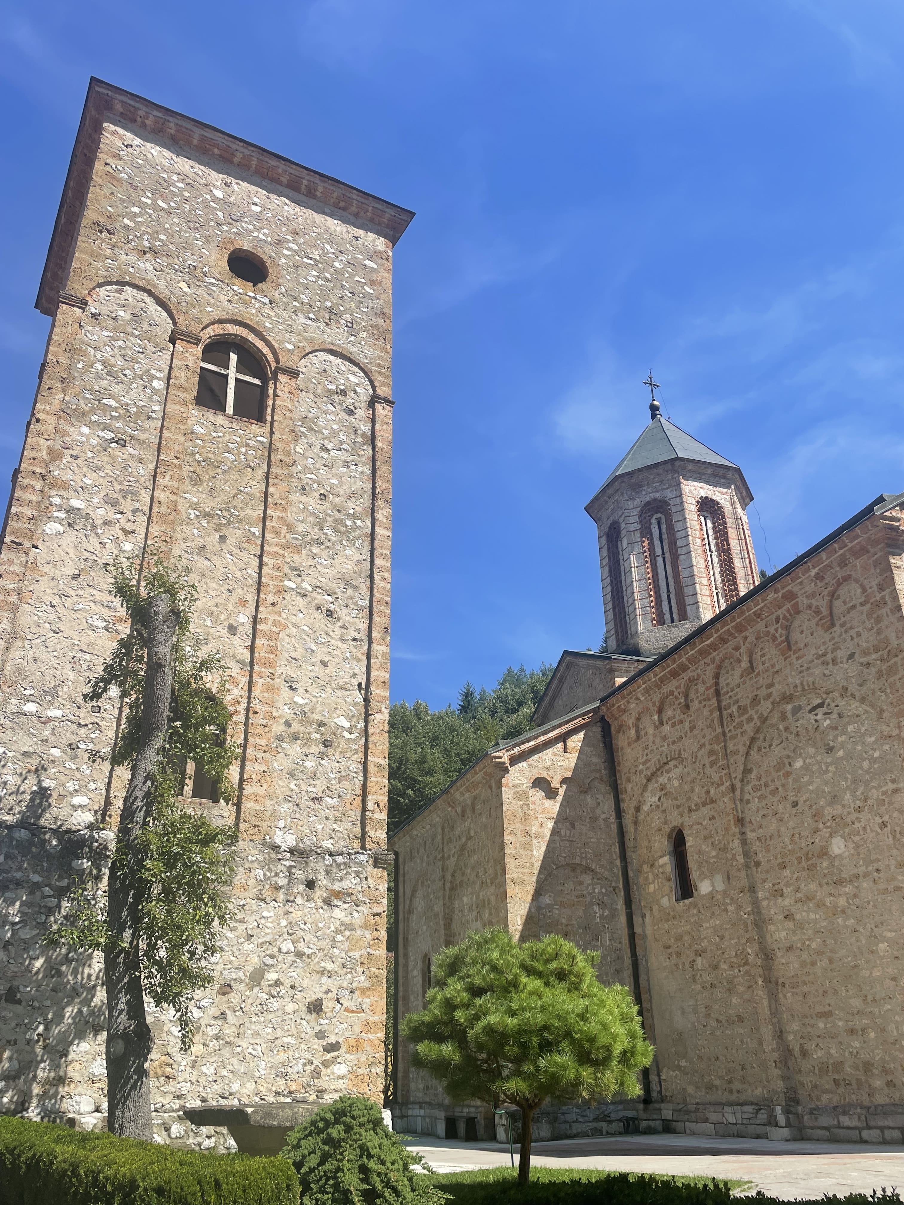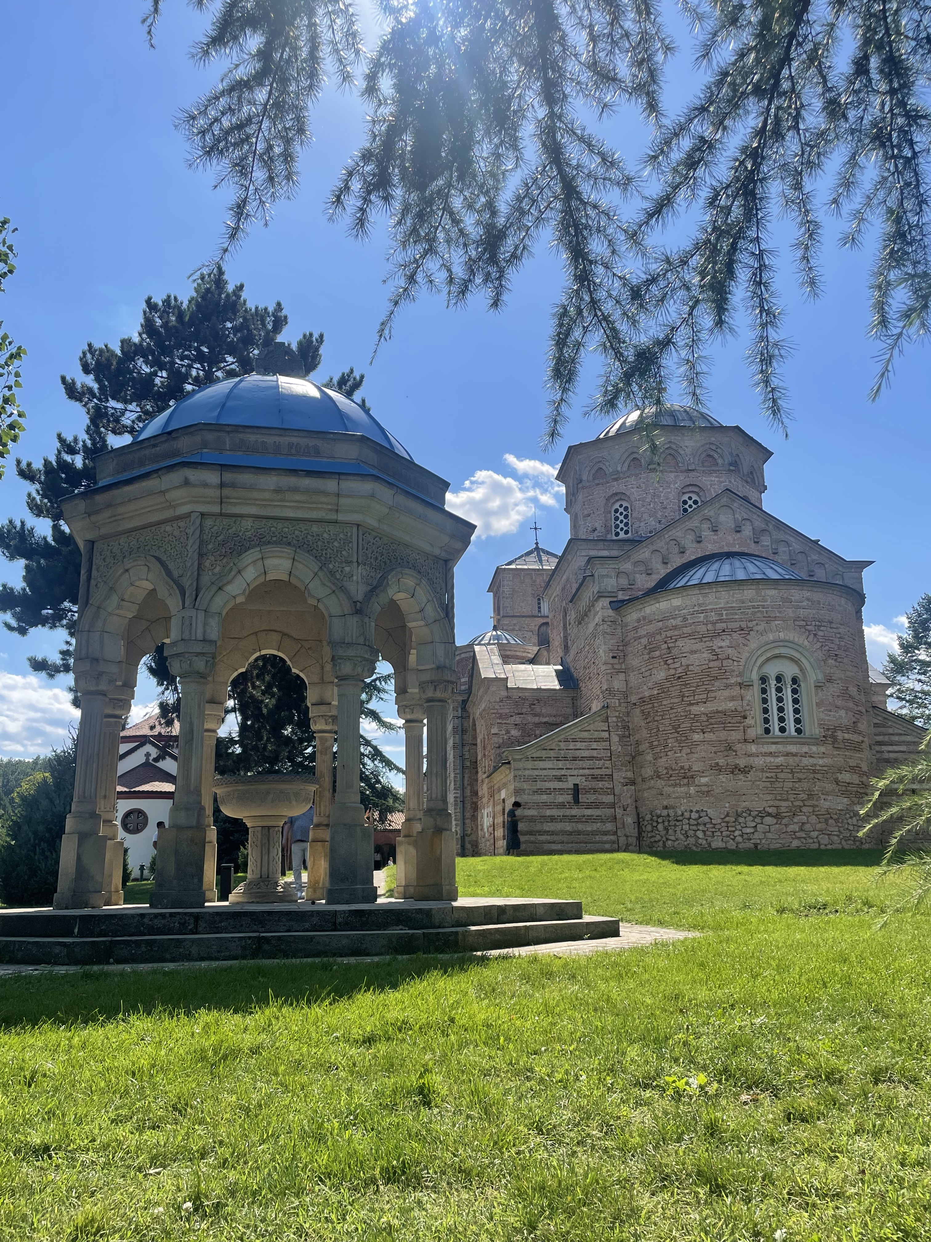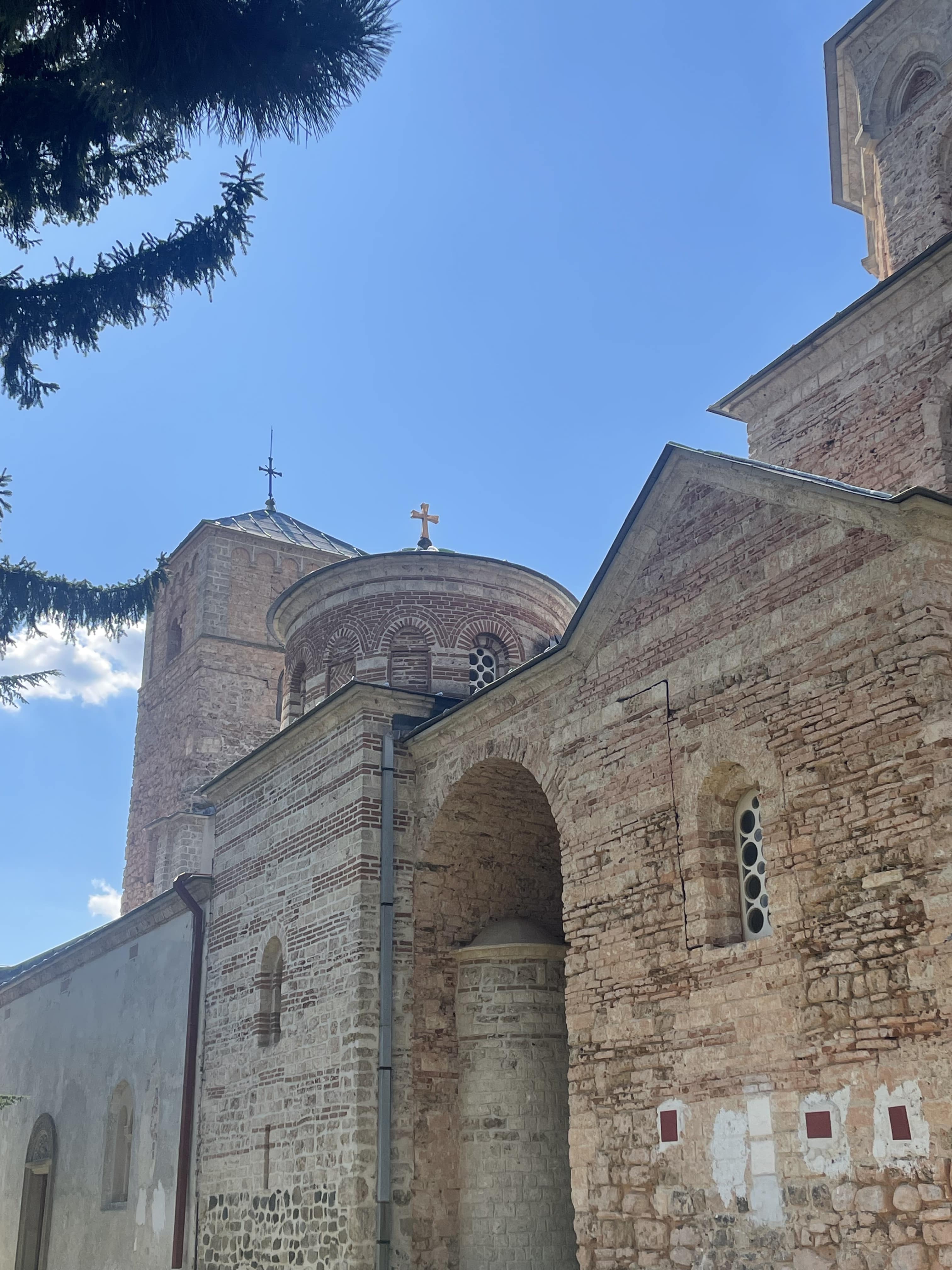Les extérieurs du monastère sont en travaux, mais cela ne gêne en rien notre visite. L’église, reconnaissable à ses murs rouges caractéristiques, est splendide. L’intérieur abrite des fresques anciennes témoignant du rôle crucial du lieu dans la culture médiévale serbe.