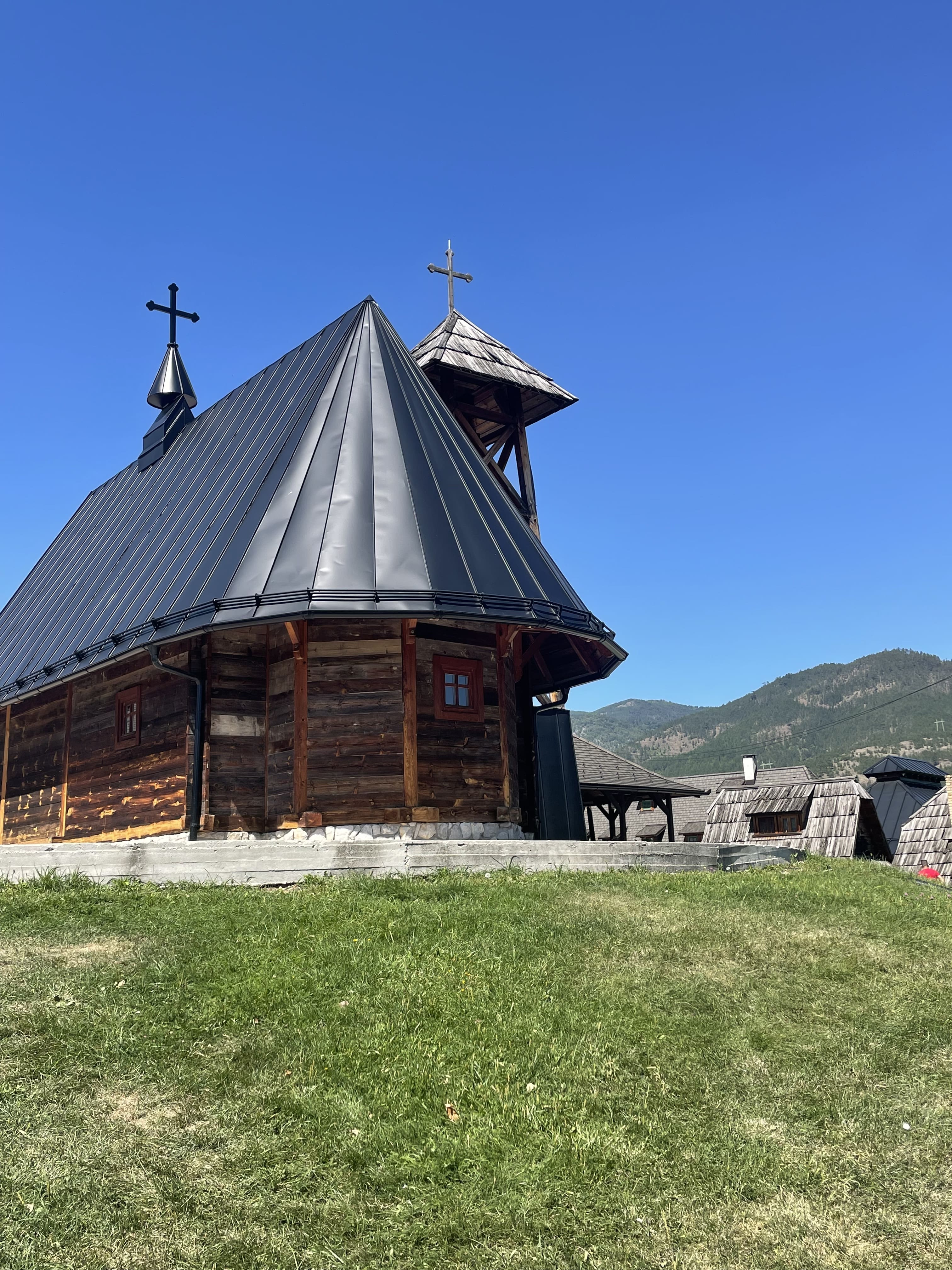 Nous nous dirigeons ensuite vers Drvengrad, le village construit par le réalisateur Emir Kusturica. Le village, aussi appelé Küstendorf ou “le village en bois”, a été entièrement fabriqué pour les besoins de son film « La vie est un miracle ». C’est un ethno-village assez esthétique, mais l’ambiance fait un peu “Disneyland”, notamment avec les 4 ou 5 restaurants présents sur un espace très réduit. On y trouve aussi une église en bois et un musée du cinema. L’entrée est payante.