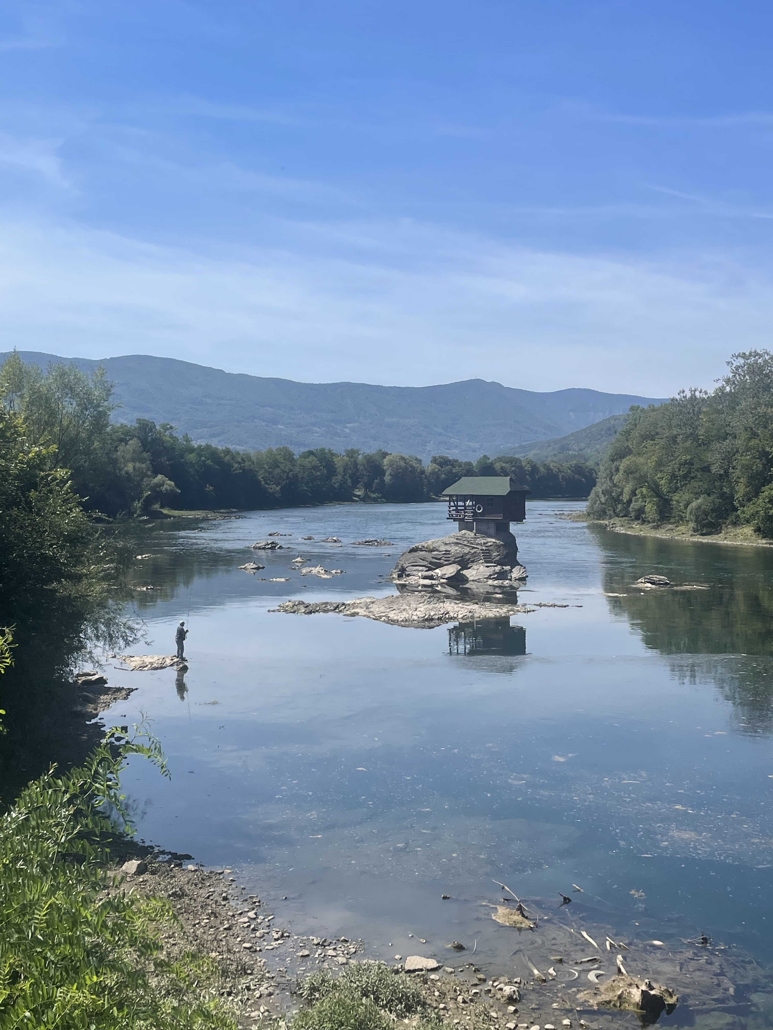 Notre premier arrêt est la célèbre Maison sur la Drina (Kućica na Drini). L’histoire est simple : en 1968, un groupe de jeunes décida de construire une petite cabane sur un rocher au milieu du fleuve Drina, qui sert de frontière naturelle entre la Serbie et la Bosnie. Plusieurs fois détruite par les crues ou les inondations, elle a été reconstruite encore et encore, devenant une icône photographique du pays. Aujourd’hui, elle apparaît même sur certaines affiches touristiques officielles de Serbie.