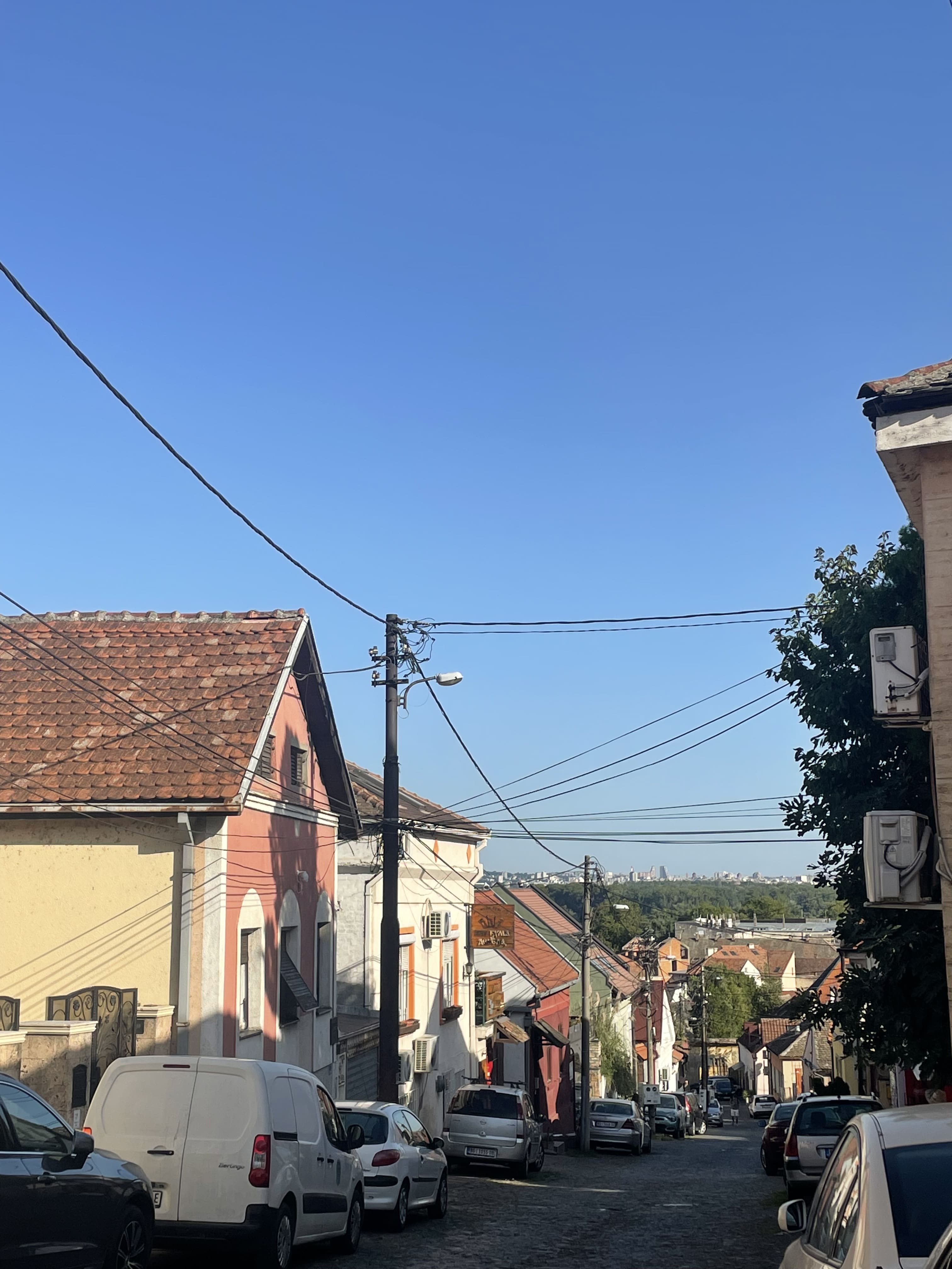 Nous montons ensuite jusqu’à Gardoš, la partie haute de Zemun, où les ruelles pavées et les maisons anciennes rappellent l’influence austro-hongroise. Nous atteignons la tour de Gardoš, construite en 1896 pour célébrer le millénaire de l’arrivée des Magyars dans la région. Depuis son sommet, la vue sur tout Belgrade est impressionnante.