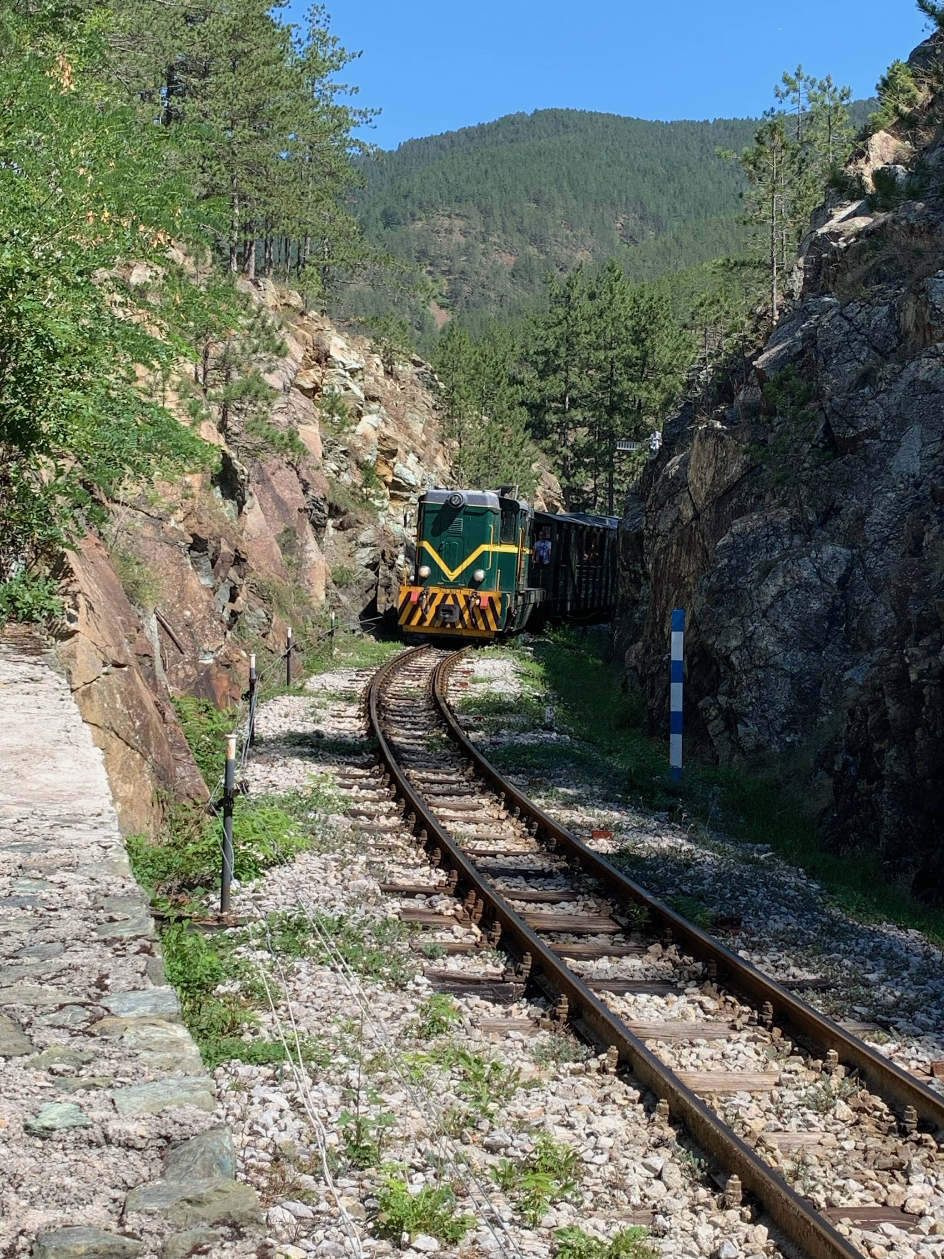 Après le départ du train, nous filons à la gare suivante pour tenter de le suivre. Par chance, nous tombons nez à nez avec lui plus haut dans la montagne : une scène très amusante ! Une fois le train passé, nous traversons et montons encore un peu, ce qui nous permet d’atteindre un belvédère offrant une superbe vue sur la ligne et les montagnes environnantes. Nous décidons d’attendre le retour du train, environ 30 minutes, en nous promenant dans la nature.