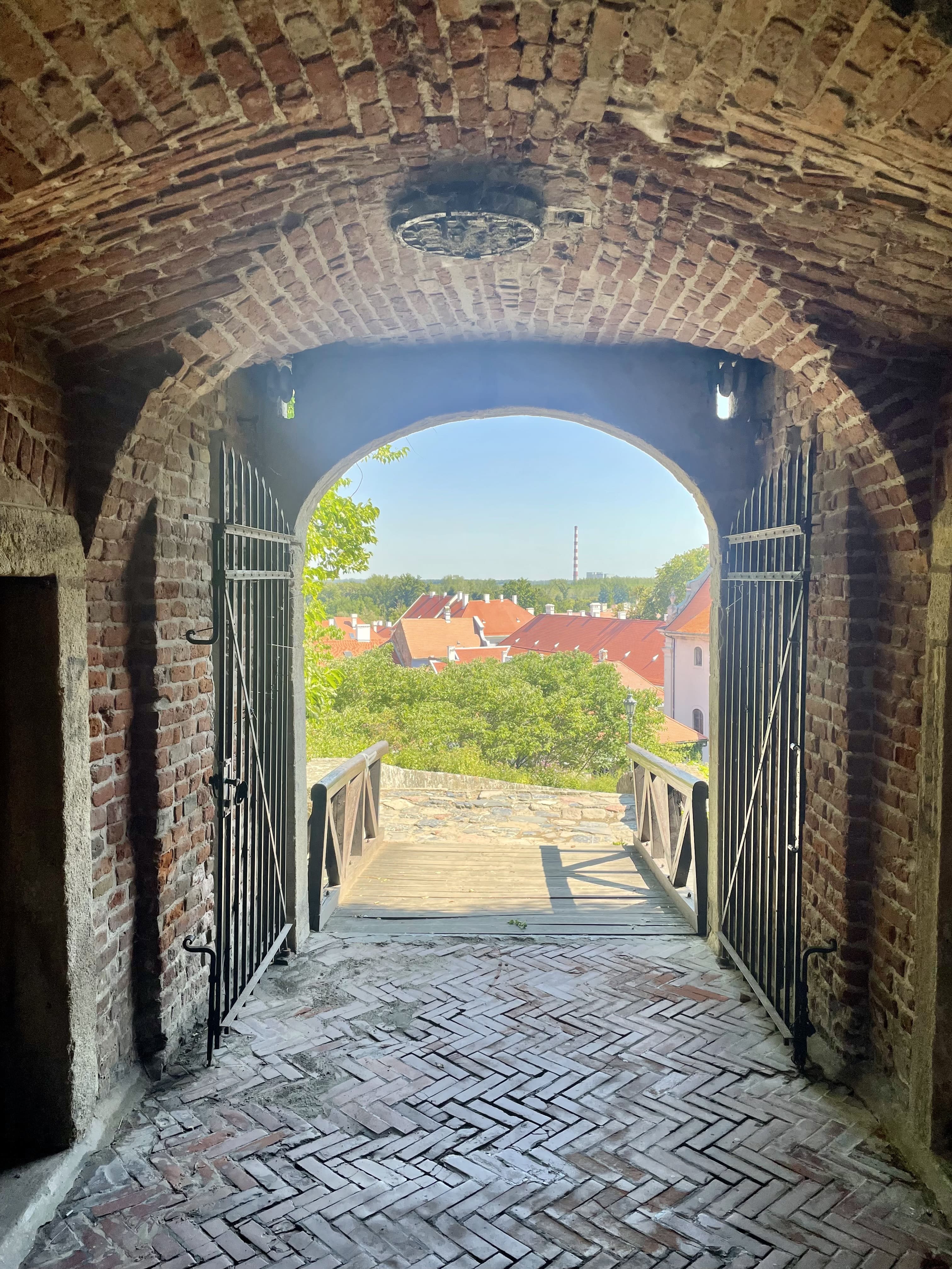 Nous traversons ensuite le parc du Danube sous une chaleur écrasante et nous arrêtons boire un jus frais à Wake Up Juice, juste devant la porte Sainte-Catherine, vestige du système défensif autrichien.