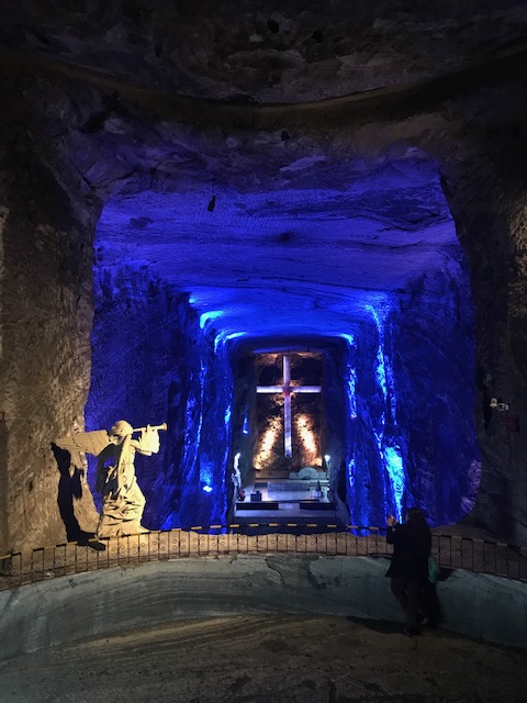 Zipaquira est connue en Colombie pour sa cathédrale de Sel. Il n’existe que 3 cathédrales de sel dans le monde, les 2 autres étant en Pologne. Le site est en fait une cathédrale creusée dans des mines de sel, à l’intérieur. L’entrée était de 56000 COP (soit environ 14 €), pas donné pour la Colombie. Des audio guides en toutes les langues sont fournies. Une fois dans la mine, l’accès se fait tout d’abord par un chemin de croix du Christ, ses 14 petites chapelles et les différentes galeries de mines très profondes. Puis nous arrivons dans l’immense cathédrale et ses 3 nefs. Peut-on imaginer à 180m sous la terre un ensemble pouvant accueillir sur 75m de long une messe de 8400 personnes ? Il faut le voir pour le croire.