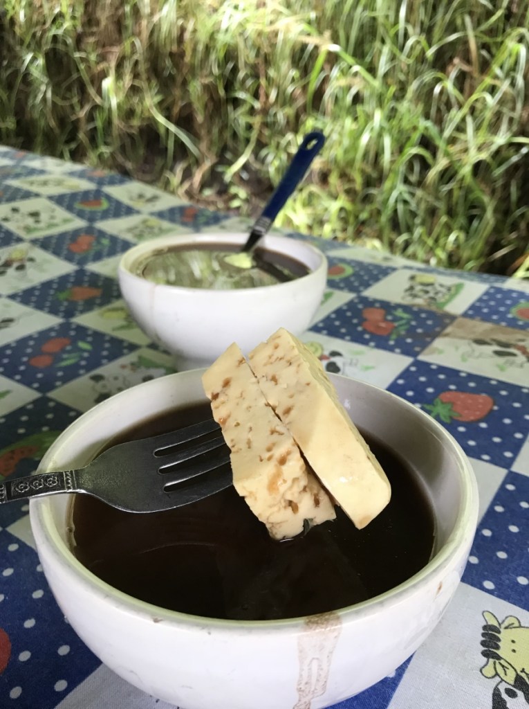 Nous avons une longue route pour arriver à Villa de Leyva, notre seconde étape. Après un tour de ville, nous sommes déposés sur la place principale. Comme il est l’heure du déjeuner, nous décidons de sortir de la ville pour trouver un petit restaurant très local Chez Jon. D’ailleurs pour le déjeuner, il est courant de demander « el menu del dia » ou « el corriente ». C’est en général un menu fixe avec entrée, plat, dessert et jus. Ici nous paierons 10000 COP avec une soupe de potiron, du riz sauté, des fraises et une nouveauté pour nous un jus de tomate de árbol, un fruit qui n’existe qu’ici.