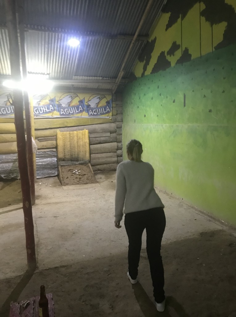 Puis nous nous lançons dans une tradition très typique de la région, le jeu du Tejo. Au bar « Los Amigos » nous tentons de comprendre les règles de ce jeu explosif. Le but est de lancer des pierres sur un carré de sable et viser des cibles pour faire le plus de points possible. Ce que tu ne sais pas, c’est que la cible est un mini explosif…qui réveille tout le bar dès que tu gagnes donc. En tout cas ce jeu nous a bien fait rire.