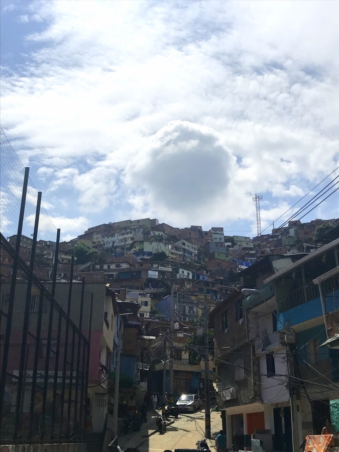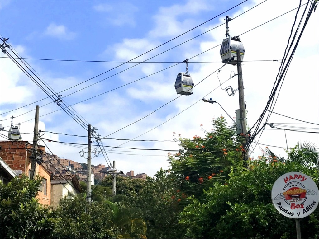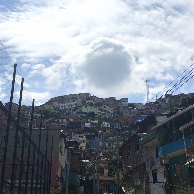 Nous prenons ensuite le fameux Metrocable (téléphérique) qui nous emmène sur une autre colline. Nous avons une magnifique vue sur la ville. Mais pas de chance pour nous, lors de notre redescente, le téléphérique est arrêté pour causes d’oranges qui guettent (en effet d’en haut, nous voyions les éclairs). Nous devons donc finir à pied. Son surnom de « Ville de l’éternel printemps » lui va si bien. Il pleut souvent sur la ville. Au départ, nous n’étions pas très rassurés, le téléphérique nous a arrêté dans un quartier inconnu dont nous ne connaissions pas la réputation.