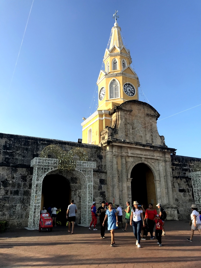 La vielle ville de Cartagena est incroyable. Elle est divisée en trois quartiers : El Centro, San Diego et Getsemani. Nous rentrons dans les remparts par la porte de l’Horloge, celle-ci reliant El Centro à Getsemani.