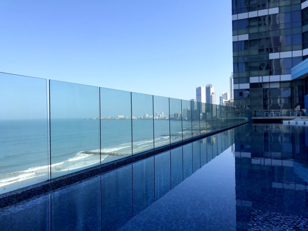 Nous avons choisi l’Intercontinental Cartagena, un super hôtel situé à Bocagrande, la partie hôtelière de la ville. L’hôtel est immense, nous avons une belle vue sur la baie depuis la chambre et une belle piscine à rebord avec vue sur la mer. D’ailleurs, 2 cocktails nous sont offerts (un daiquiri maracuja – mon parfum préféré) par l’hôte, bien mérités.